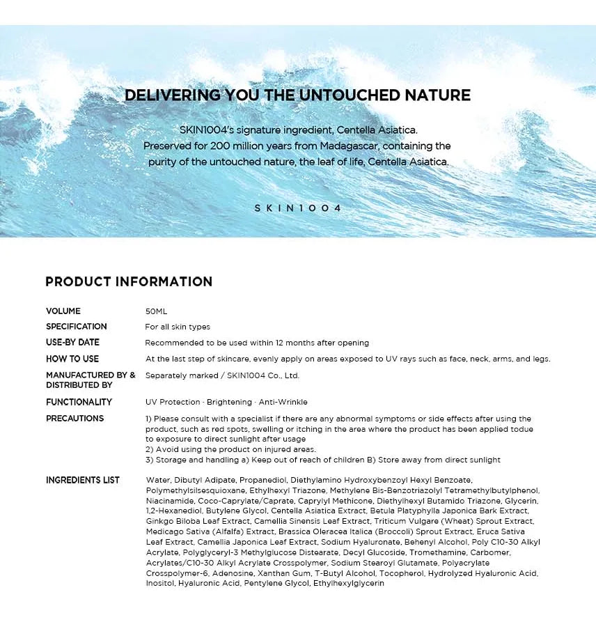 Water, Dibutyl Adipate, Propanediol, Diethylamino Hydroxybenzoyl Hexyl Benzoate, Polymethylsilsesquioxane, Ethylhexyl Triazone, Methylene Bis-Benzotriazolyl Tetramethylbutylphenol, Niacinamide, Coco-Caprylate/Caprate, Caprylyl Methicone, Diethylhexyl Butamido Triazone, Glycerine, 1,2-Hexanediol, Butylene Glycol, Centella Asiatica Extract(9800PPM), Betula Alba Bark/Leaf Extract, Ginkgo Biloba Leaf Extract, Camellia Sinensis Leaf Extract, Triticum Vulgare Sprout Extract, Medicago Sativa Leaf Extract, Brassica Oleracea Italica Sprout Extract, Eruca Sativa Leaf Extract, Camellia Japonica Leaf Extract, Sodium Hyaluronate(10PPM), Behenyl Alcohol, Poly C10-30 Alkyl Acrylate, Polyglyceryl-3 Methylglucose Distearate, Decyl Glucoside Tromethamine, Carbomer, Acrylates/C10-30 Alkyl Acrylate Crosspolymer, Sodium Stearoyl Glutamate, Polyacrylate Crosspolymer-6, Adenosine, Xanthan Gum, t-Butyl Alcohol, Tocopherol, Hydrolyzed Hyaluronic Acid(1PPM), Inositol, Hyaluronic Acid(0.01PPM), Pentylene Glycol, Ethylhexylglycerin